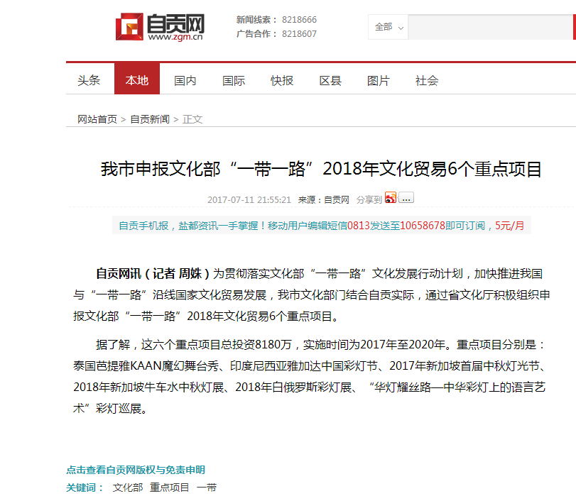 為落實“一帶一路”國家戰(zhàn)略,呼應(yīng)國家、省、市“一帶一路”重大倡議目標,我公司以“絲路之燈東方來”為主線積極拓展境外市場。目前公司新加坡、俄羅斯兩個燈展項目,被自貢文化部門推薦入錄國家文化部“一帶一路”2018年文化貿(mào)易重點項目申報庫。自貢市上報的文化貿(mào)易重點項目共計6個。