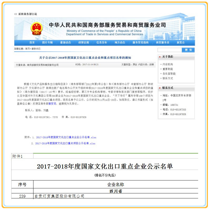 自貢燈貿(mào)集團(tuán)股份有限公司入錄“2017-2018年度國家文化出口重點企業(yè)”公示名目。這是自貢燈貿(mào)集團(tuán)股份有限公司自2007年以來,第六次榮獲此殊榮,也是全國彩燈行業(yè)唯一連續(xù)六屆十二年獲此殊榮的企業(yè)。
