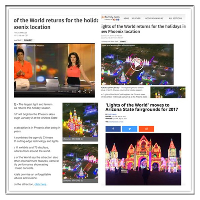 開(kāi)幕式上菲尼克斯印第安原住民、拉丁裔、華人、墨西哥等各族裔文化藝術(shù)團(tuán)體表演了豐富多彩的歌舞節(jié)目,展示了菲尼克斯多元文化風(fēng)采。瑰麗的花燈、燦爛的民間藝術(shù)和強(qiáng)大的演出陣容,園內(nèi)數(shù)千名美國(guó)觀眾無(wú)不歡呼雀躍、拍手稱(chēng)奇。美國(guó)亞利桑那州各大主流媒體、華人媒體全面采訪報(bào)導(dǎo)了燈會(huì)開(kāi)幕式盛況。菲尼克斯當(dāng)?shù)匦侣劇?Now @ 6 》報(bào)道稱(chēng)“2017世界之光彩燈嘉年華是北美最大的彩燈節(jié),是全球文化集合地,游客仿佛置身于迪士尼中。”