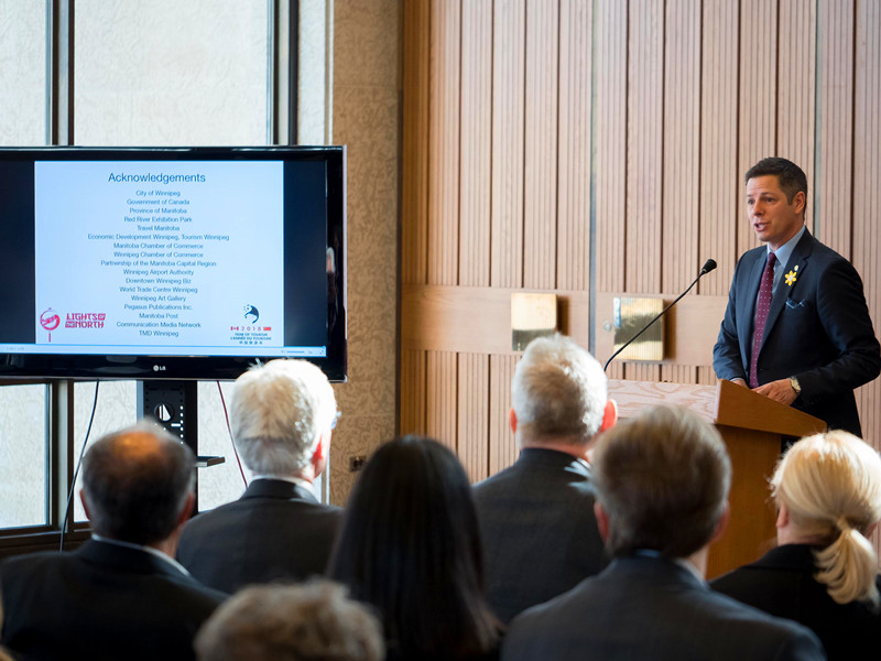溫尼伯市市長BRIAN BOWMAN發(fā)布會(huì)上誠邀天下客,共賞東方燈,他說:“北境之光——溫尼伯中華彩燈嘉年華”是“2018中加旅游年”的重頭戲,我們非常期待本次活動(dòng),屆時(shí)悠久璀璨的中華文明將帶給加拿大民眾一場(chǎng)神奇的光影之旅,也誠摯邀請(qǐng)各國游客來溫尼伯做客。在4月5日召開的曼省議會(huì)上專題介紹了本次燈展,并對(duì)燈會(huì)給予了高度評(píng)價(jià)。會(huì)上全體省議員集體起立,為燈展項(xiàng)目鼓掌一分鐘。