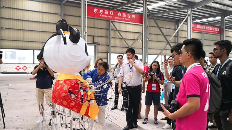 走進東方彩燈出口基地,來到“東方彩燈 點亮世界”項目境外燈展制作現(xiàn)場,青年朋友們近距離的詳細(xì)了解了彩燈的制作流程和工藝。交流團成員為東方彩燈足跡遍布世界30多個國家咋咋稱奇,為燈貿(mào)集團精妙絕倫的彩燈頻頻點贊。