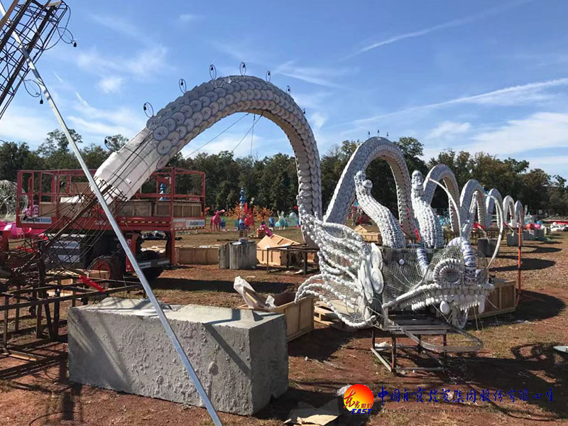美的創(chuàng)造離不開現(xiàn)代科技手段,“2018年華盛頓環(huán)球燈會”運用有:LED幻彩變光技術(shù),使燈組物理空間上的呈現(xiàn)更加動感迷人;光束燈技術(shù),美輪美奐的五彩射光,伴隨著音樂的變化此起彼伏,現(xiàn)場觀看最能切身體會魅力四射的藝術(shù)效果;吹塑紙技術(shù)的創(chuàng)新,營造出光鮮亮麗、惟妙惟肖的事物造型,讓人嘆為觀止;特殊材質(zhì)飲料瓶這一精湛工藝,在環(huán)保的同時又呼吁人們愛護自熱環(huán)境;仿真技術(shù)的成熟應(yīng)用,又還原了遠古時代的恐龍世界。