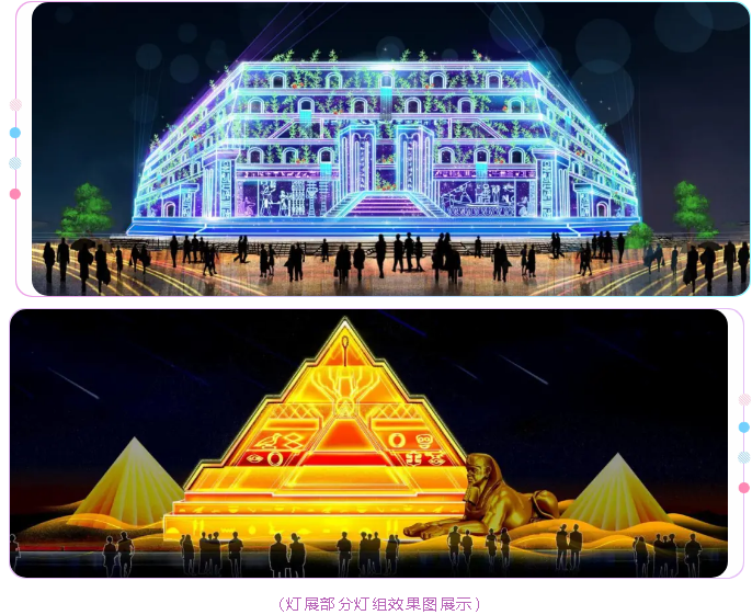 由自貢燈貿(mào)集團(tuán)股份有限公司承制的“桔橙光影 大雅丹棱”燈光節(jié),以“北緯30度,世界最神奇的存在”為主線,情景展開這一緯度上的奇觀絕景和神秘文化。精湛的彩燈工藝和現(xiàn)代光影技術(shù),散發(fā)著異乎尋常和夢(mèng)幻的光影色彩,為游人展示北緯30度各國的文化表情和最璀璨的古老文明。