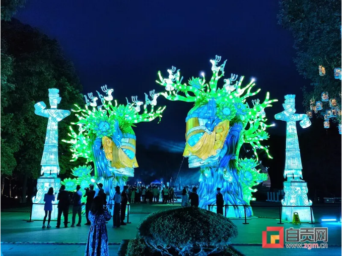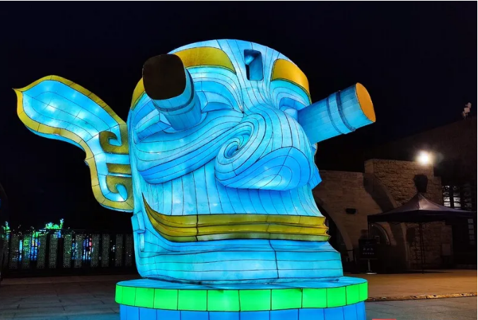 這次燈展由中青旅聯(lián)科策劃、自貢燈貿(mào)集團打造,設(shè)計靈感都來自于三星堆實體文物、考古發(fā)現(xiàn),包括包括青銅大立人、青銅縱目面具、青銅神樹、黃金面具、青銅神鳥等。