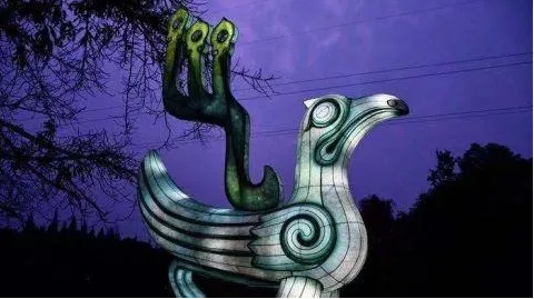 入口兩側(cè)(橋外側(cè))處,設(shè)置了兩只相似但不相同的鳳鳥燈組立于入口兩側(cè)通道處,高2.8米。以青銅鳳鳥為設(shè)計(jì)原型,鳥與蜀族之關(guān)系極為密切,三星堆館藏文物中有眾多的鳳鳥形器物及紋飾圖案。