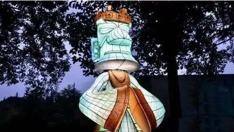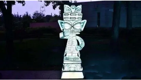 據(jù)自貢燈貿(mào)集團(tuán)設(shè)計(jì)總監(jiān)陳潔介紹,在入口廣場處的燈組以青銅縱目面具為設(shè)計(jì)原型,作為三星堆“六大國寶”之一的青銅縱目面具,寬1.38米,高0.645米,眼睛呈柱狀向外凸,是館藏中形體最大的青銅面具。本燈組按比例還原青銅縱目面具,燈組高3.2米,寬3.4米。