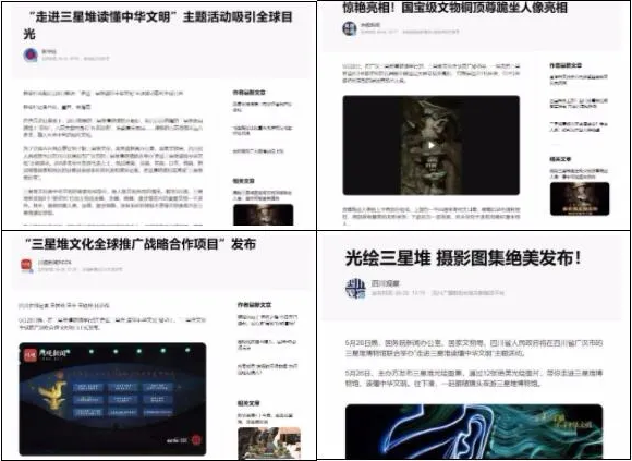 截至5月29日10點,各大主流媒體紛紛推出《光繪三星堆 攝影圖集絕美發(fā)布!》《揭開古蜀國神秘面紗 走進三星堆體驗博物館奇妙夜》《新出土千余件重要文物后 三星堆吸引中外媒體讀懂中華文明》《三星堆國寶文物銅頂尊跪坐人像亮相!》《“三星堆文化全球推廣戰(zhàn)略合作”9大項目正式發(fā)布》等新聞報道。