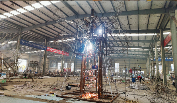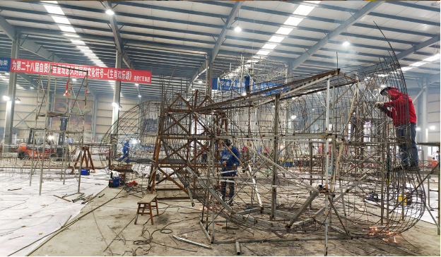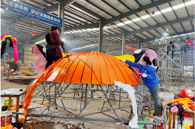 走進(jìn)燈貿(mào)集團(tuán)生產(chǎn)現(xiàn)場,呈現(xiàn)眼前的是一篇繁忙景象。近200名東方彩燈的工匠按照放樣、造型、噴涂、電器安裝、裱糊、美術(shù)處理等生產(chǎn)流程,井然有序、熱火朝天地開展生產(chǎn)。但見,造型師焊槍焰火、飛火流星;電器師神工妙力,串接璀璨;裱糊師巧奪天工,斑斕溢彩;美術(shù)師鬼斧神工,爐火純青......